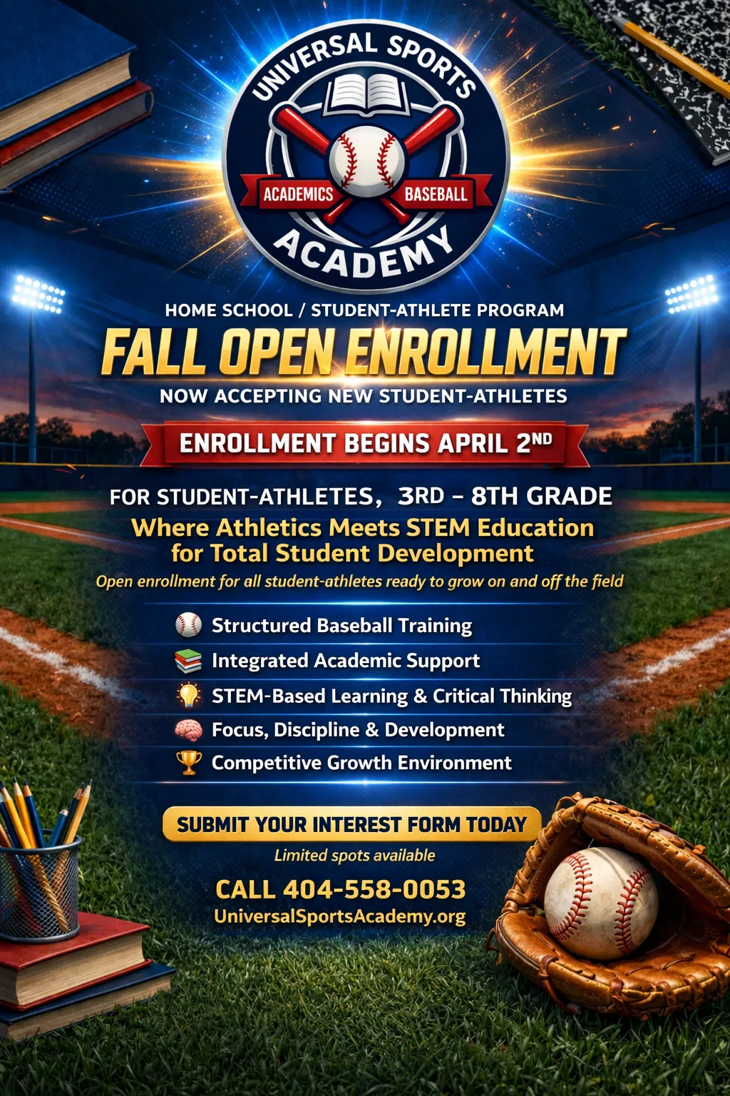 Our mission at Universal Sports Academy is to serve as both an education and baseball academy, providing high-quality academic instruction home school model and baseball training that focuses on player development, academic excellence, teamwork, sportsmanship, and discipline. We aim to nurture well-rounded young athletes, both academically and athletically, who are prepared for higher-level opportunities on the field, in the classroom, and in life